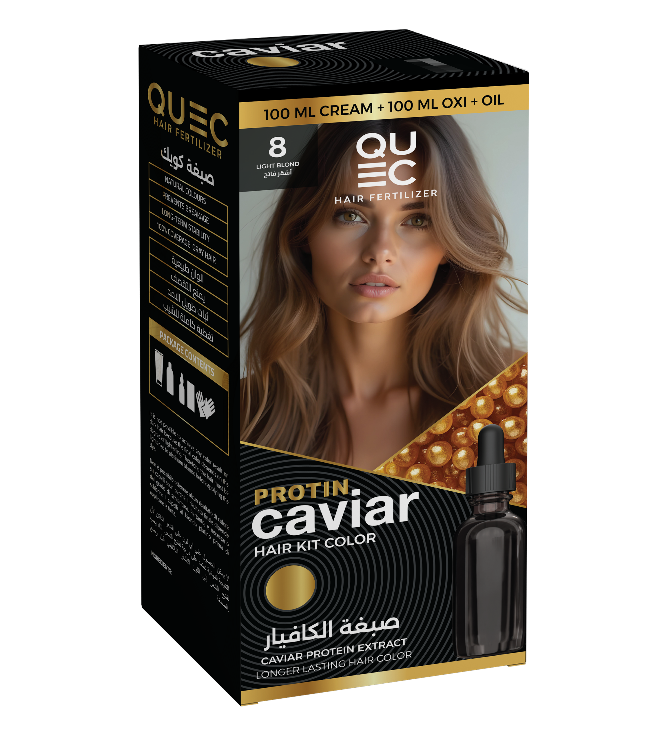 Low-ammonia hair color kit enriched with caviar protein, providing vibrant color, nourishment, and long-lasting shine.